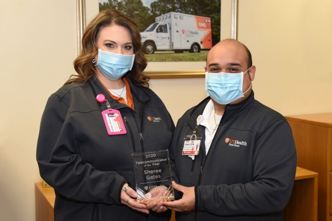 Sheree Gates receives the 2020 UT Health East Texas Telecommunicator of the Year award from Ivan Leon, UT Health East Texas EMS/ AIR 1 Communications Manager.