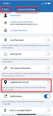 2. In Account Settings, look for Appointment Arrival and tap the button to the “on” status. This will walk you through step-by-step instructions to turn on location services on your device and within the app.