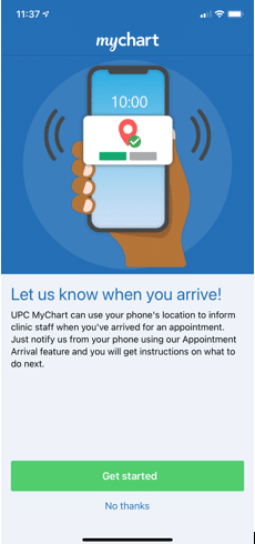 By turning on the appointment arrival setting in MyChart, you can receive push notifications on your mobile device with easy-to-follow steps to check-in before entering the waiting room for your appointment.